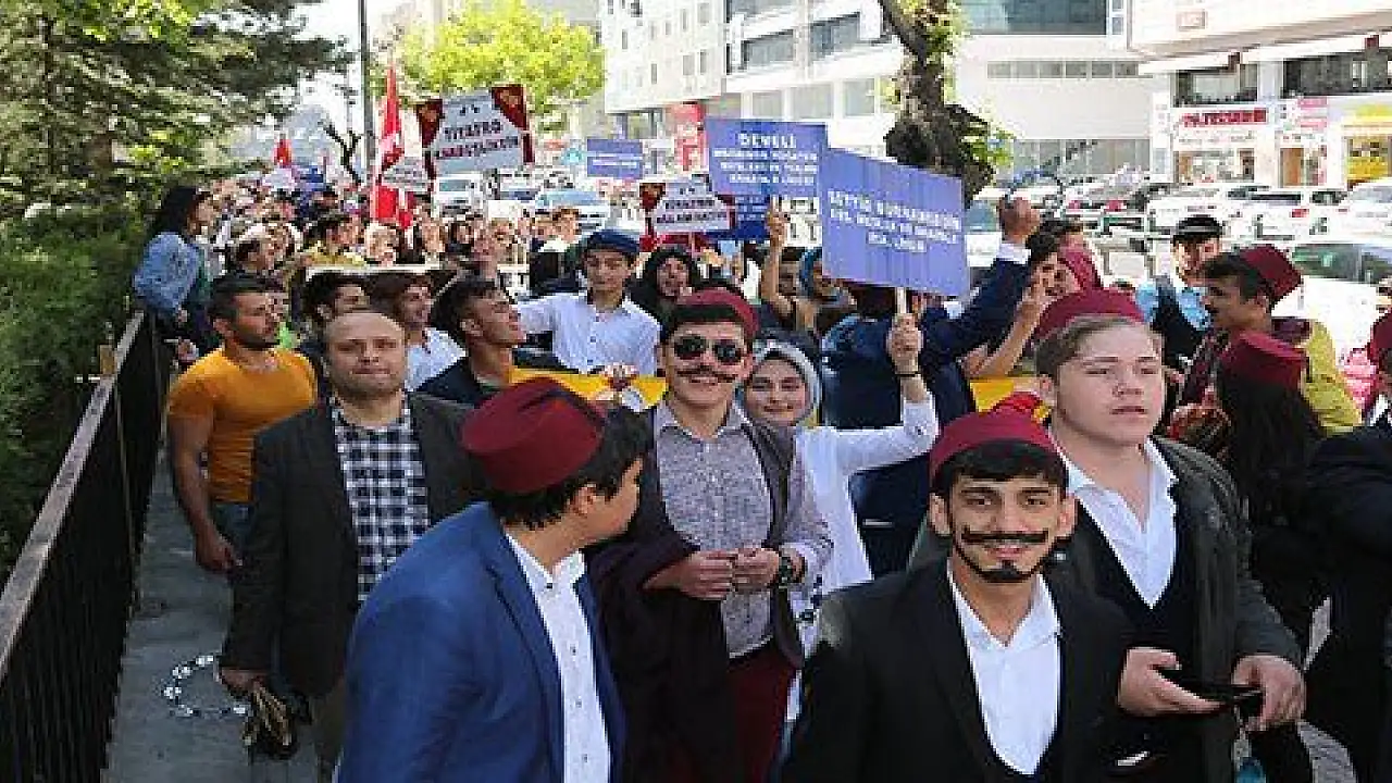Büyükşehir Belediyesi’nin Uluslararası Liselerarası Tiyatro Festivali’ne katılacak gruplar, bir kortej oluşturarak Büyükşehir Belediyesi’nden Şehir Tiyatrosu’na yürüyüş yaptılar. Okullar, Büyükşehir Belediye Bandosu eşliğinde yapılan yürüyüşe sahneleyecekleri oyunların kostümleriyle katıldılar.