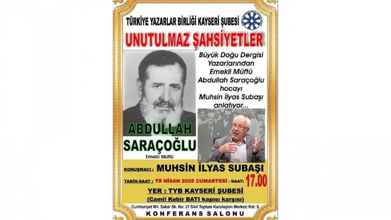 Türkiye Yazarlar Birliği (TYB) Kayseri Şubesi, kültür ve düşünce dünyamıza iz bırakmış önemli isimleri anmaya devam ediyor. Bu kapsamda düzenlenen ‘Unutulmaz Şahsiyetler’ programının bu ayki konusu, Büyük Doğu Dergisi yazarlarından emekli müftü Abdullah Saraçoğlu olacak.