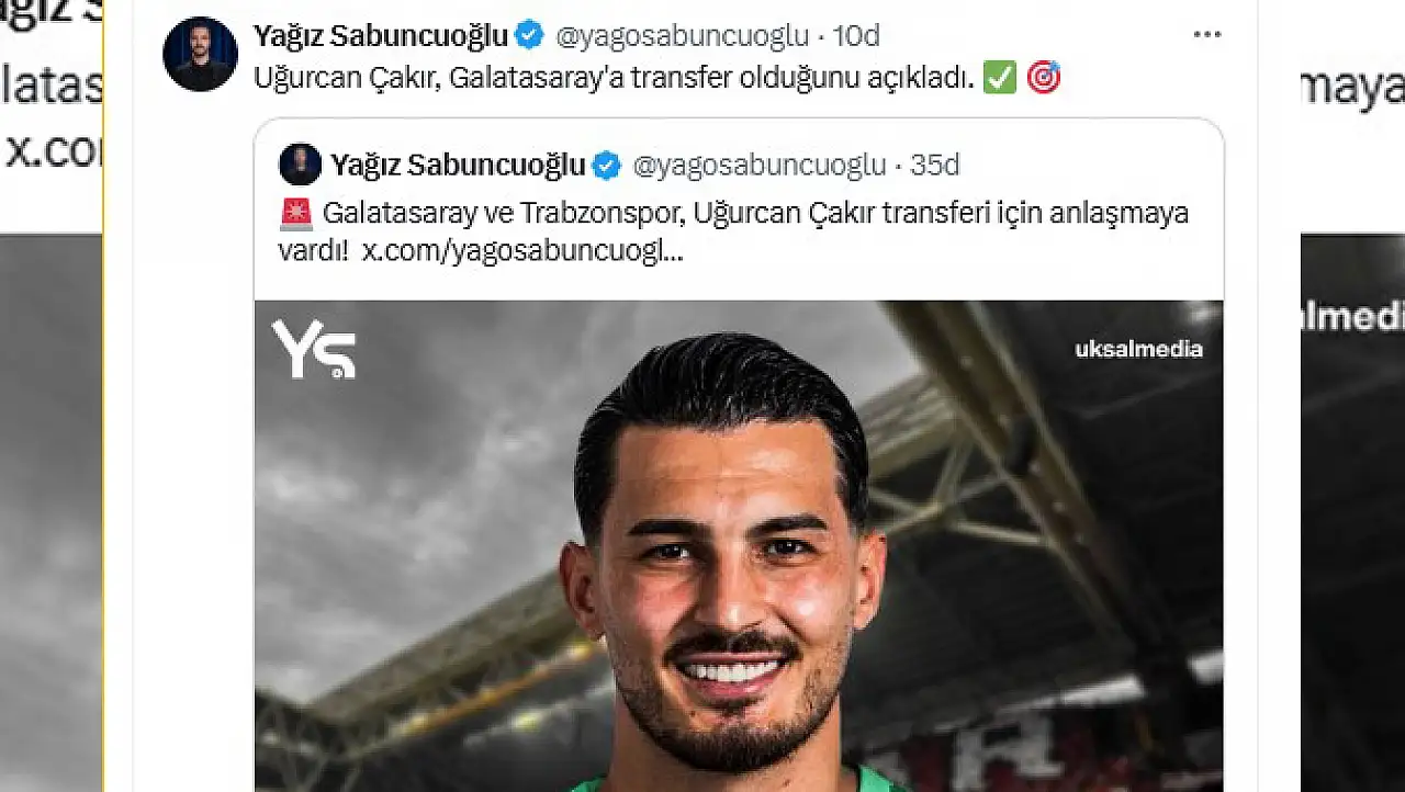Galatasaray ve Trabzonspor, kaleci Uğurcan Çakır transferi için karşılıklı olarak anlaşma sağladı. Anlaşmayı gazeteci Yağız Sabuncuoğlu duyurdu. Genç gazeteci ilk paylaşımında, “Galatasaray ve Trabzonspor, Uğurcan Çakır transferi için anlaşmaya vardı!” dedi. Ardından da, “Uğurcan Çakır, Galatasaray'a transfer olduğunu açıkladı.” ifadelerini kullandı.