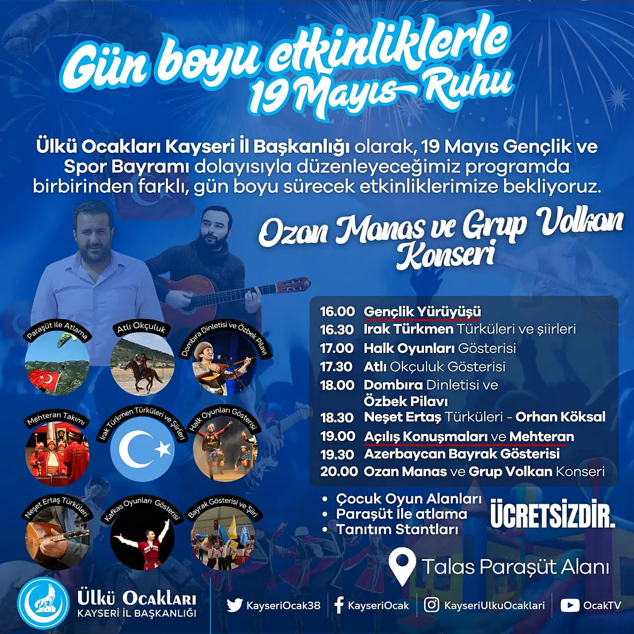 Ülkü Ocakları Kayseri İl Başkanlığı, 19 Mayıs Atatürk'ü Anma, Gençlik ve Spor Bayramı dolayısıyla özel bir etkinlik programı düzenleyecek. Detaylar Kayseri Anadolu Haber'de...