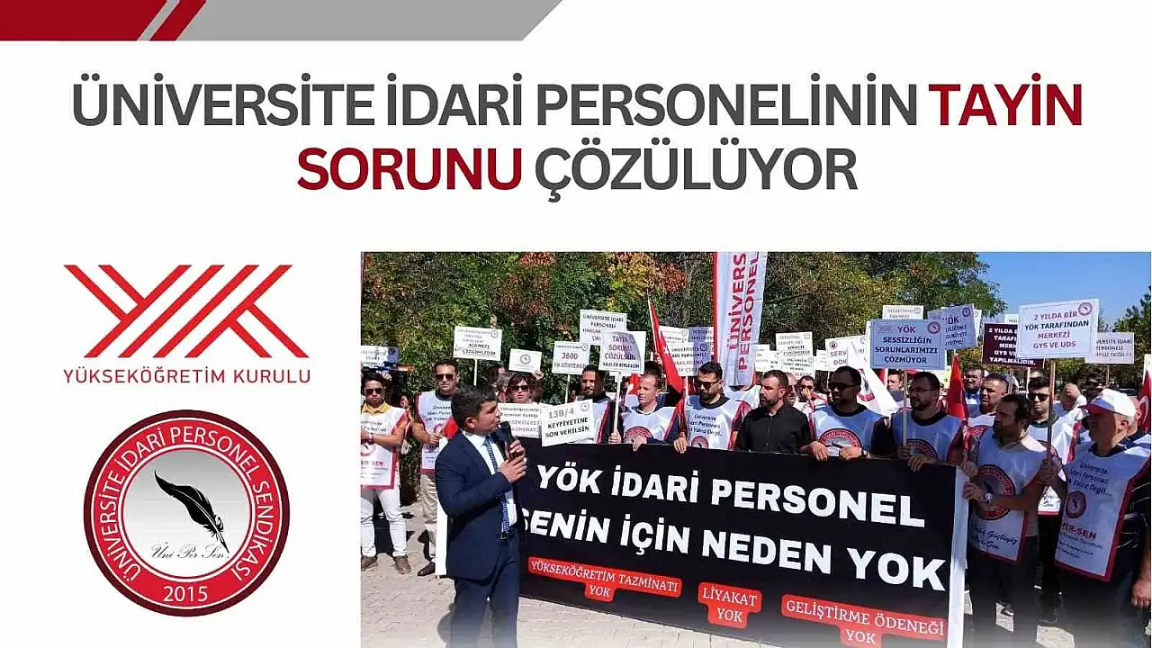 Üniversite İdari Personel Sendikası (ÜNİPERSEN), dün Yükseköğretim Kurulu’nun Üniversite idari personelinin 45 yıldır beklediği tayin sorununun çözümü üzerine yaptığı açıklamada, "Yükseköğretim Kurulu Başkanlığının girişimleri ve Cumhurbaşkanlığının onayı ile üniversite idari personelinin karşılıklı yer değişikliği konusunda yürütülen çalışmalar tamamlanmıştır" hepimizi heyecanlandıran ve mutlu eden bir adım olmuştur" ifadesini kullandı.