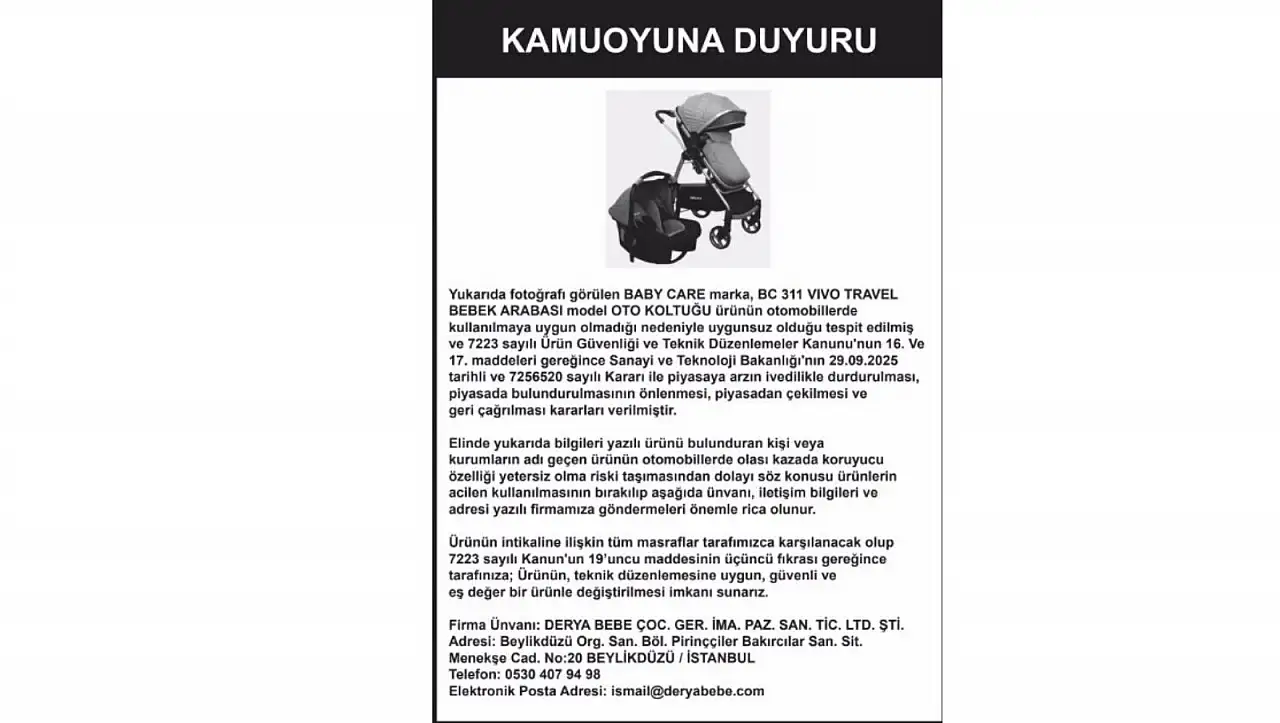 Sanayi ve Teknoloji Bakanlığının aldığı kararda Baby Care marka BC 311 VIVO Travel Bebek arabası model oto koltuğu ürünü otomobillerde kullanıma uygun olmadığının tespit edildiği ifade edildi. 7223 sayılı Ürün Güvenliği ve Teknik Düzenlemeler Kanununun 16. ve 17. maddeleri gereğince ilgili ürünün piyasaya arzının ivedilikle durdurulmasına, piyasada bulundurulmasının önlenmesine, piyasadan çekilmesine ve geri çağrılmasına karar verildi.