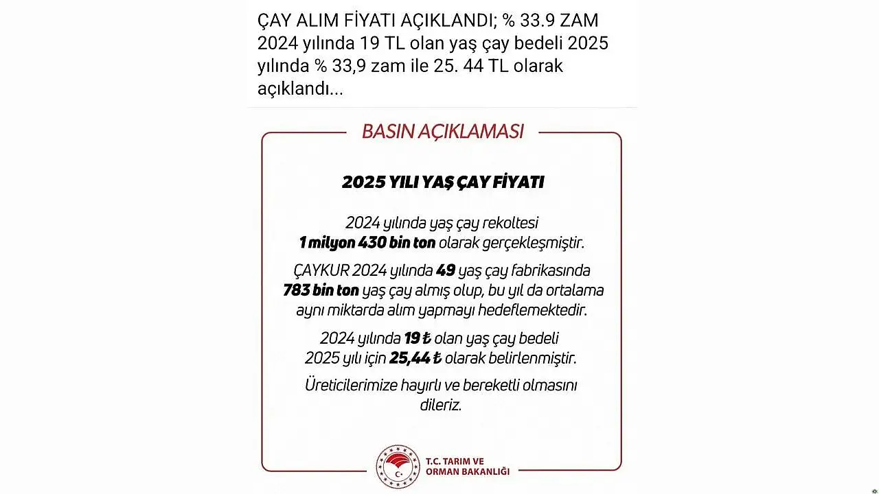 Tarım ve Orman Bakanlığı, 2025 yılı yaş çay alım fiyatını kamuoyuyla paylaştı. Yapılan açıklamaya göre, geçtiğimiz yıl 19 TL olarak uygulanan yaş çay alım fiyatı, bu yıl yüzde 33,9 oranında artırılarak 25,44 TL’ye çıkarıldı.