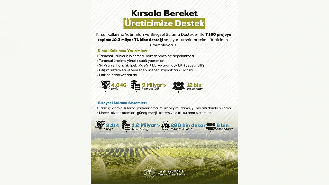 Bu kapsamda ise 3 bin 114 projenin hayata geçirildiği ve 1,2 milyar TL hibe desteği sağlandığı belirtildi. Ayrıca, 280 bin dekar alanda modern sulama sistemleri kurulduğu bunun da verimliliği artırarak daha sürdürülebilir bir tarım yapısının oluşmasına katkı sağladığı belirtildi. 6 bin kişinin de bu projeler sayesinde istihdam edildiği kaydedildi.