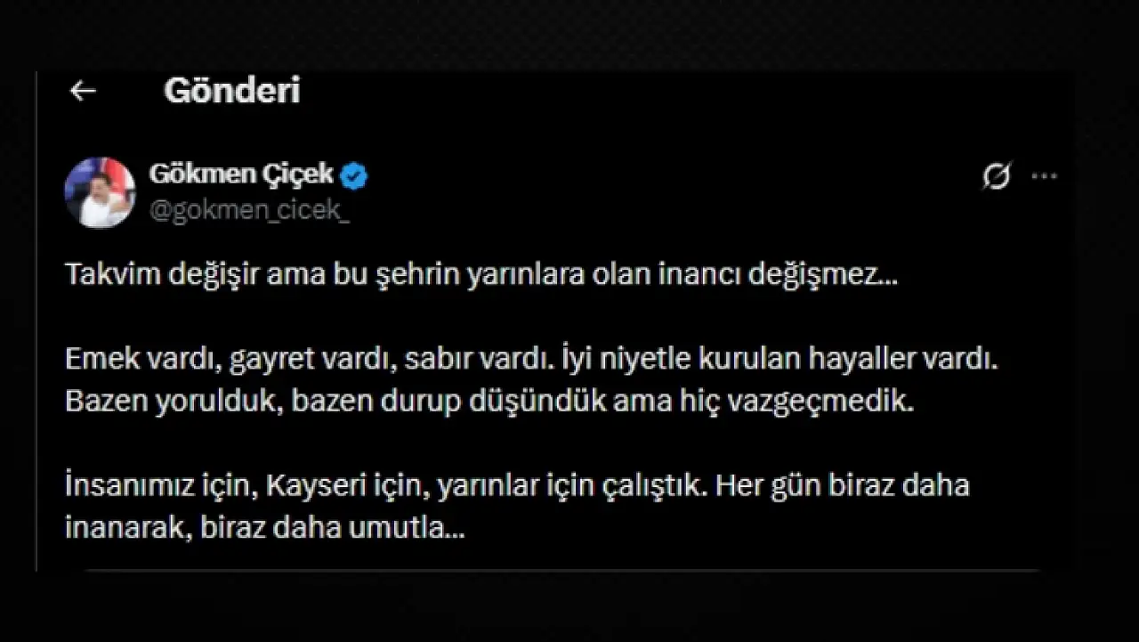 Paylaşımda, ‘Emek vardı, gayret vardı, sabır vardı. İyi niyetle kurulan hayaller vardı. Bazen yorulduk, bazen durup düşündük ama hiç vazgeçmedik’ ifadelerine yer verildi. Mesajda, insanlar için, Kayseri için ve yarınlar için çalışıldığı vurgulandı.