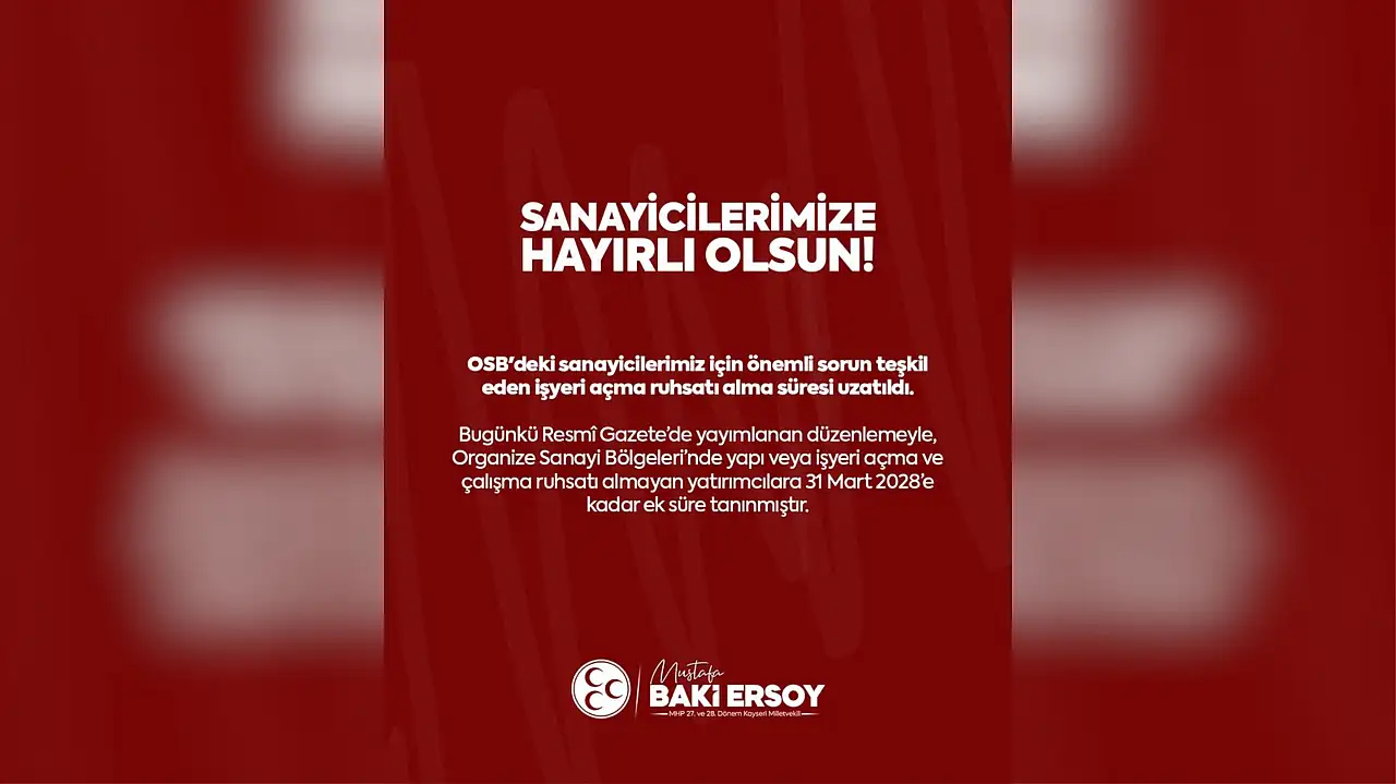 Milliyetçi Hareket Partisi Kayseri Milletvekili Baki Ersoy yaptığı paylaşımda Kayseri'de de sanayiciler tarafından dile getirilen ve önemli bir sorun haline gelen işyeri açma ve çalışma ruhsatı alımı için sürecin uzatıldığı müjdesini verdi.