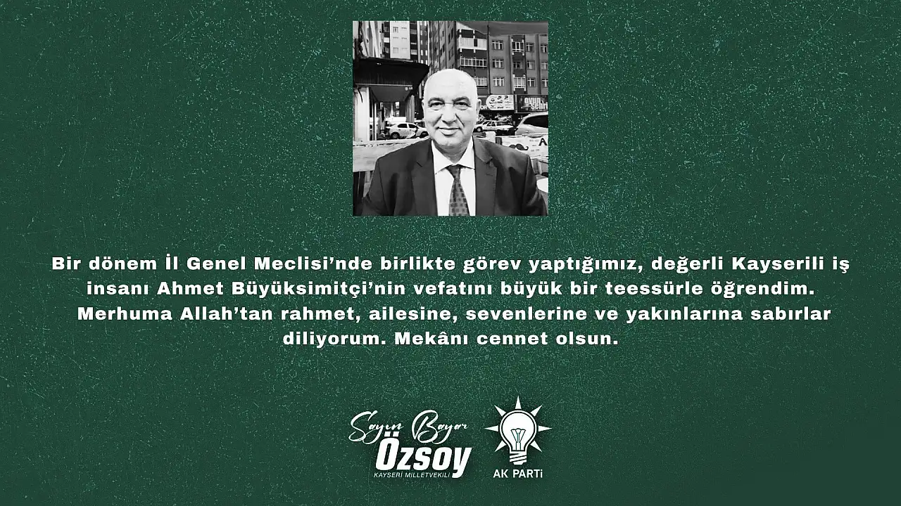 AK Parti Kayseri Milletvekili Sayın Bayar Özsoy sosyal medya hesabı üzerinden yaptığı paylaşımda Kayserili İş İnsanı Ahmet Büyüksimitçi'nin vefatından duyduğu üzüntüyü dile getirdi.