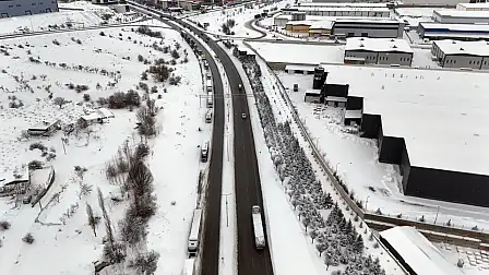 Yola devam edemeyen tırlar Mimarsinan Organize Sanayi Bölgesi'nde bulunan alanlarda yol açılana kadar park halinde beklerken havadan dron ile görüntülendi. Ortaya çıkan görüntüler sınır kapısında bekleyen tırları hatırlattı.