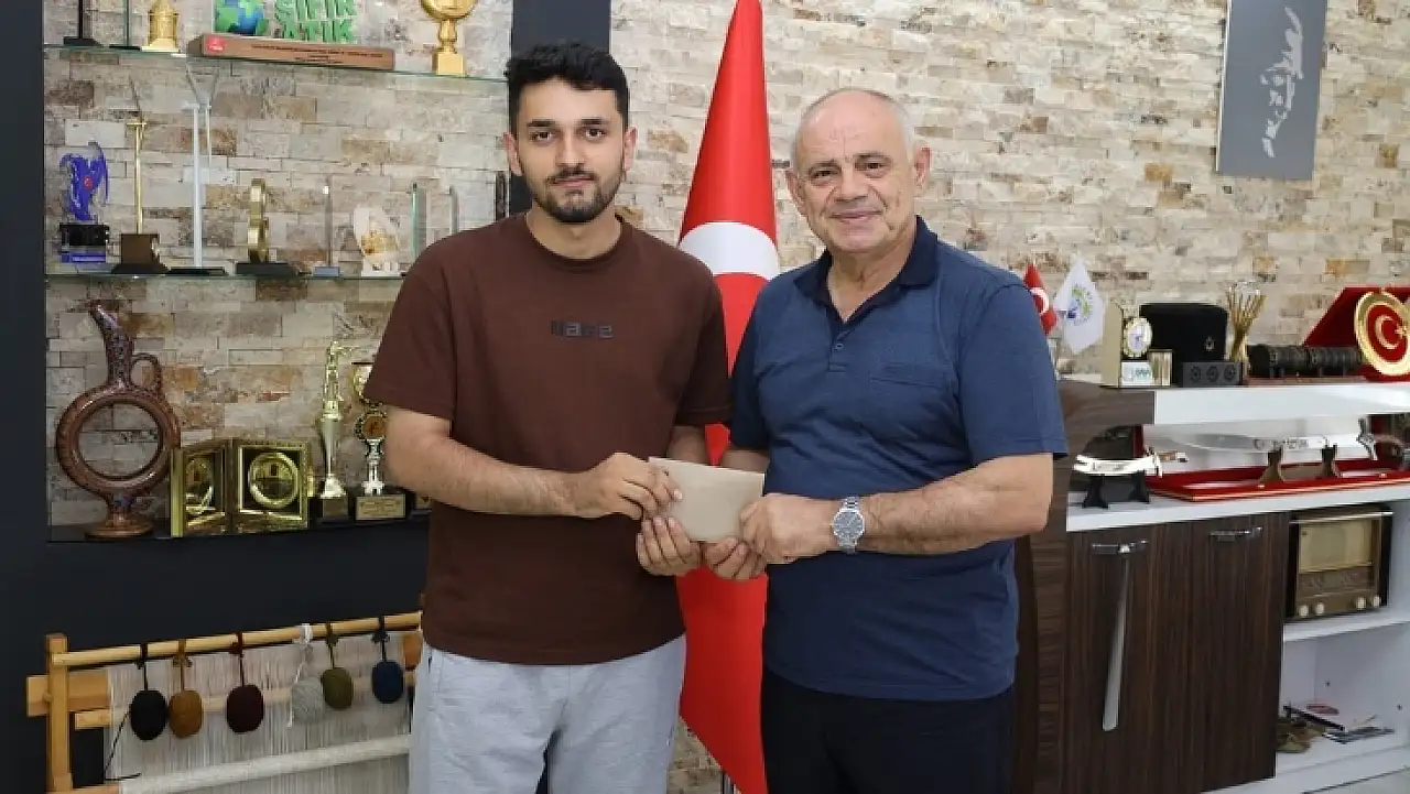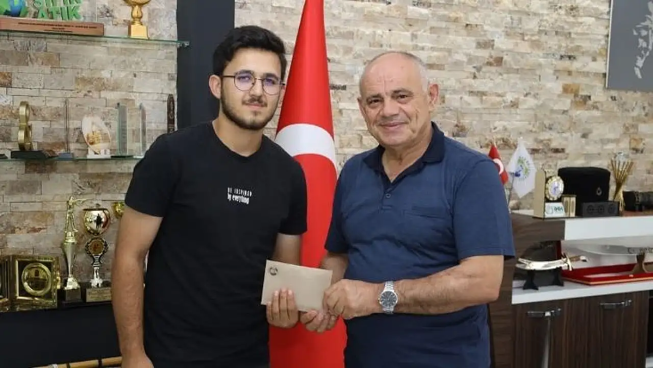 Kütahya Sağlık Bilimleri Üniversitesi Tıp Fakültesi’ni kazanan Alperen Çakır ile İzmir Kâtip Çelebi Üniversitesi Tıp Fakültesi’ni kazanan Mehmet Ali Bayraktar, Başkan Öztürk tarafından tebrik edilerek ödüllendirildi.