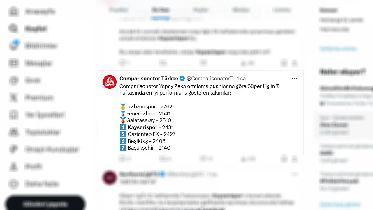Comparisonator Yapay Zeka da Ersoy’un bu söylemini doğruladı. Comparisonator Yapay Zeka ortalama puanlarına göre Süper Lig'in 7. haftasında en iyi performans gösteren takımlar arasında Kayserispor da yer aldı... Özellikle maçın ilk yarısında çok etkili bir futbol ortaya koyan Sarı-Kırmızılılar, gol atamamış olsa da göze hoş gelen, baskılı bir maç çıkardı..