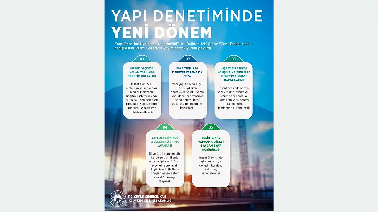 Yeni düzenlemeler, özellikle inşaat sektörü ve yapı denetim firmaları için önemli yenilikler ve kolaylıklar getiriyor. Yapılan değişikliklerle ilgili olarak sosyal medya paylaşımı yapan Çevre Şehircilik ve İklim Değişikliği Bakanlığı ‘’Yapı Denetimi Uygulama Yönetmeliği’, ‘Dağıtım Tebliği’ ve ‘Ceza Tebliği’ndeki değişiklikler yürürlüğe girdi’’ merak edin soruları yanıtladı.