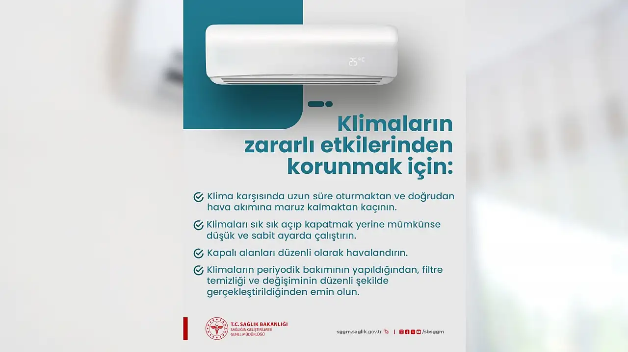 Sağlık Bakanlığı, Sağlığın Geliştirilmesi Genel Müdürlüğü sosyal medya hesabı üzerinden yaptığı paylaşımlarla vatandaşları bilgilendirmeye devam ediyor. Bu doğrultuda Genel Müdürlük tarafından yapılan paylaşıma göre klima karşısında uzun süre oturmaktan ve doğrudan hava akımına maruz kalmaktan kaçınmak gerekiyor.