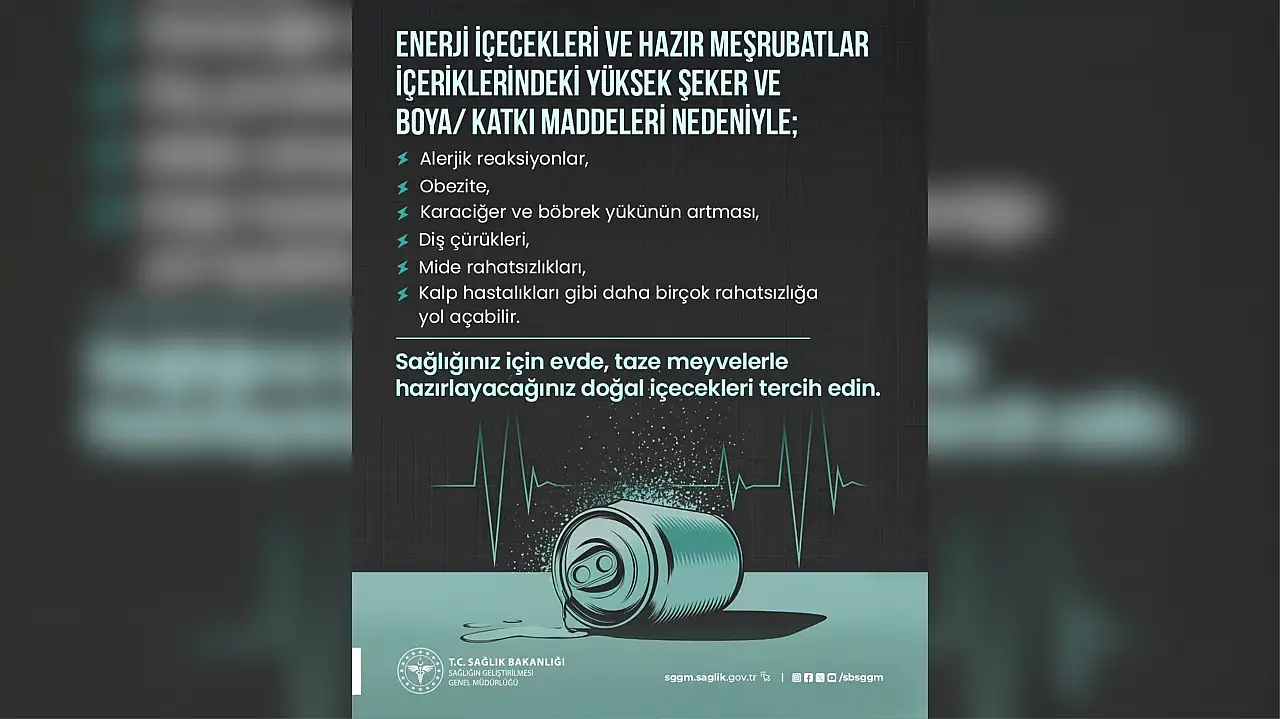 Sağlık Bakanlığı, Sağlığın Geliştirilmesi Genel Müdürlüğü tarafından yapılan sosyal medya paylaşımları vatandaşları toplumsal konularda bilgilendirmeye devam ediyor. Bakanlık tarafından yapılan paylaşımda Enerji içecekleri ve hazır meşrubat içeceklerinin tehlikelerine değinildi.