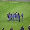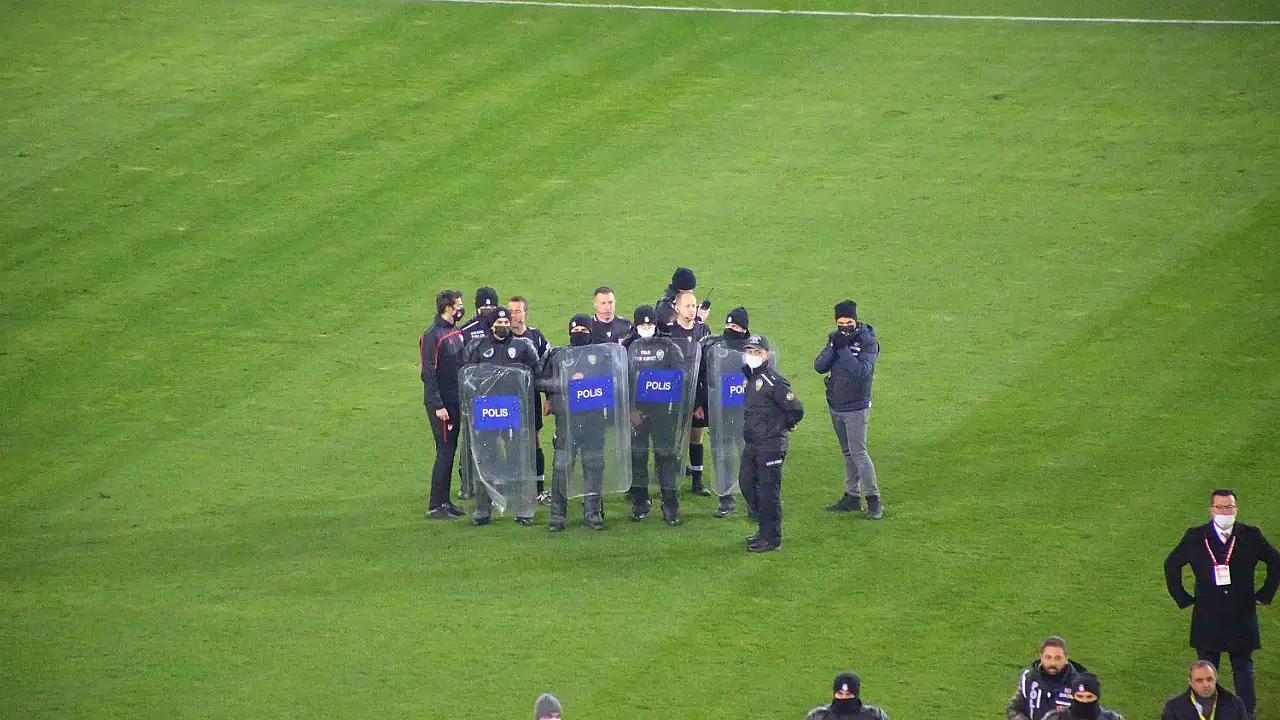 Çok sayıda polis ekibinin sahada önlem alması ile çevik kuvvet kalkanları altında sahadan çıkarılan hakemlere, bu sırada da taraftarlar pet şişe atarak tepki gösterdi.
