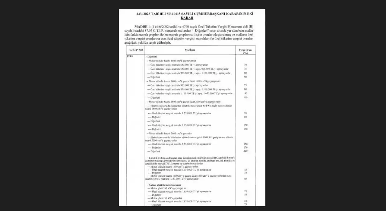 Otomotiv sektöründe ÖTV oranlarının düzenlenmesine yönelik hükümler içeren ‘Türk Parasının Kıymetini Koruma Hakkında Kanun ile Bazı Kanunlarda ve 635 Sayılı Kanun Hükmünde Kararnamede Değişiklik Yapılmasına Dair Kanun’ ile konuya ilişkin Cumhurbaşkanlığı Kararı, Resmi Gazete’de yayımlanarak yürürlüğe girdi.