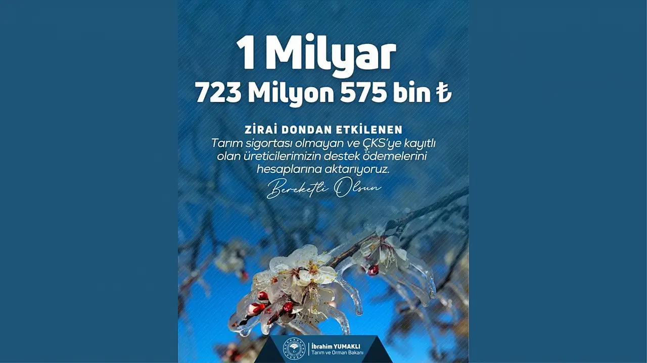 Tarım ve Orman Bakanı İbrahim Yumaklı yaptığı açıklamada: ‘’Tarım sigortası bulunmayan ancak Çiftçi Kayıt Sistemi’ne (ÇKS) kayıtlı üreticilerimize, önceki ödemelerin devamı olarak 1 milyar 723 milyon TL daha aktarıyoruz. Böylece toplamda 22 milyar 148 milyon TL zirai don desteği üreticilerimizin hesaplarına ulaştırılmış oldu. Zirai don kapsamında üreticilerimize destek ödemelerine devam edeceğiz'' ifadelerine yer verdi.